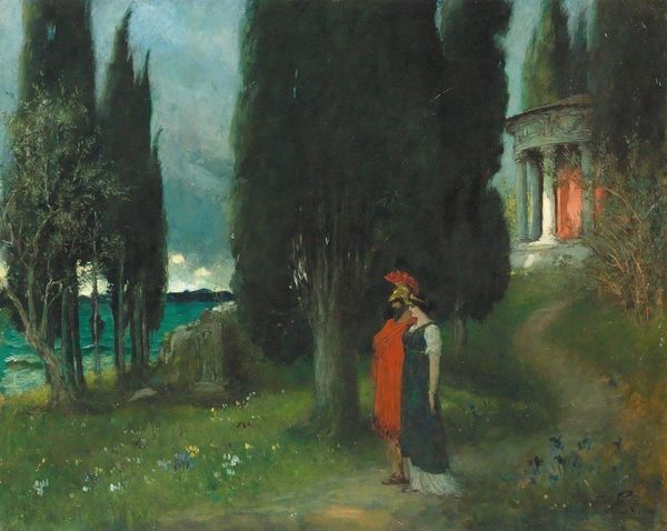 Editor: This is "Chateau Des Tresors," by Boleslas Biegas, done in oil paint. The painting has a rather dreamlike feel; the figures look almost otherworldly, illuminated against the somber landscape. What do you make of it? Curator: Oh, Biegas always invites us into these intensely personal landscapes, doesn't he? For me, it’s a visual poem – those stylized trees, that peculiar little building. It whispers of sacred spaces. I think Biegas invites us to step inside the architecture of our souls. Tell me, what pulls you in first? Editor: I think it’s that strange building—almost like a temple but so stylized and a bit unsettling. What's it all about? Curator: It's interesting you say 'temple.' Biegas loved Symbolism, and everything held deeper meanings. Perhaps it represents an entry to another state of being, and those figures adorning it like silent guardians or maybe the echo of past selves? It certainly exudes an introspective air, a space for solitary reflection and transformation. Editor: It’s certainly working—making me question everything. The lone figure in white almost seems like they're approaching it to reflect, but seems very distant from the building, making the purpose seem uncertain. Curator: Precisely! Distance lends perspective. That little white shape embodies humanity contemplating life's bigger enigmas. It invites questions instead of neatly packaged answers. And doesn’t that speak to our own journeys of understanding the Chateau of Treasures—our very selves? Editor: Definitely. It is like looking into a mirror in some ways, but one that is heavily distorted with strange fantasy elements and almost nightmare undertones. Thanks, I will need to ponder the relationship between humanity, transformation, and hidden meanings!
