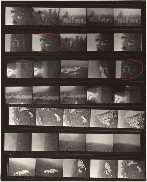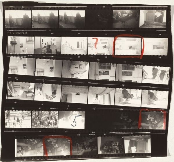 Curator: Well, this is a striking gelatin silver print from 1952 by Robert Frank titled "Valencia, Spain 18." My first impression is a sense of disjointed memory. It's presented as a contact sheet, not a finished image. Editor: It certainly has a rough-and-ready quality. You immediately get a sense of the photographic process laid bare. The artist seemingly documented life and land as material – fishing boats and the ubiquitous presence of the sea as witness. Curator: Exactly. The raw, unedited quality really emphasizes the post-war moment, and the gritty social realities that Frank explored through his lens. You feel the hand of the photographer, not just in composition but in selection, by virtue of the red pencil markings we see. It’s as if Frank is inviting us into his working methods, acknowledging the political and economic context inherent to it. Editor: Definitely. You notice how Frank captures buildings, rail tracks, beaches with local people. The train suggests technological advance, and with its pollution, is set against people fishing as if straight from central casting for social progress! Curator: Yes, and in showing the development process as an inherent part of the aesthetic expression, Frank really questions the whole idea of art existing within traditional gallery boundaries. We're encouraged to think of the act of creating, its origins. These raw photographic frames ask whether it's possible to detach aesthetics from manufacture. Editor: He prompts the viewer to confront not just the image but how that image came into being; that act of recording, cropping, the role of film stock and darkroom alchemy. What a powerful tool for making us conscious about photographic art! Curator: Precisely. It challenges us to reconsider how social observations themselves contribute to the dialogue concerning fine art, particularly where such work gains acceptance and acknowledgment within an institutional context. Editor: Thinking about its process and material offers valuable and accessible means to rethink high-low divisions in art. This truly embodies art rooted in social context! Curator: A fantastic point. Considering the final edits marked on this work, it speaks to how social narrative plays an active role in redefining art’s purpose within our world. Editor: Indeed. Through the lens of labor, production and circumstance, this contact sheet moves us toward seeing art for its tangible and relational worth.