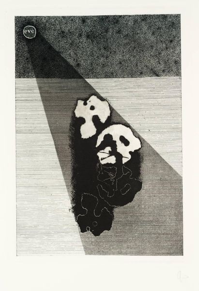 Editor: Harold Cohen's untitled print from 1968 uses stark blacks and blues, juxtaposed against a smooth white form. What symbols or meanings do you see embedded within this abstract composition? Curator: The knitted blue suggests a domestic space, a sense of comfort, perhaps even vulnerability. Notice the stark contrast with the smooth, almost alien-like, white form. It evokes feelings of intrusion or perhaps transformation, a disruption to the familiar. What does the stark tonal contrast evoke for you? Editor: I see a contrast of textures, a soft versus hard quality that perhaps suggests an emotional tension. Curator: Precisely. Consider how these contrasting elements—the domestic and the foreign—speak to broader societal anxieties of the late 1960s, the era when this work was created. The image creates a powerful visual metaphor about disruption and change. Editor: That gives me a new way to look at it. Thank you!