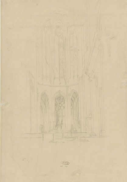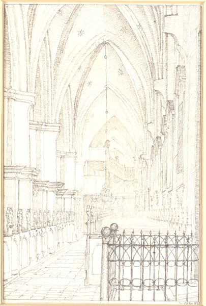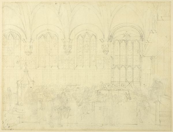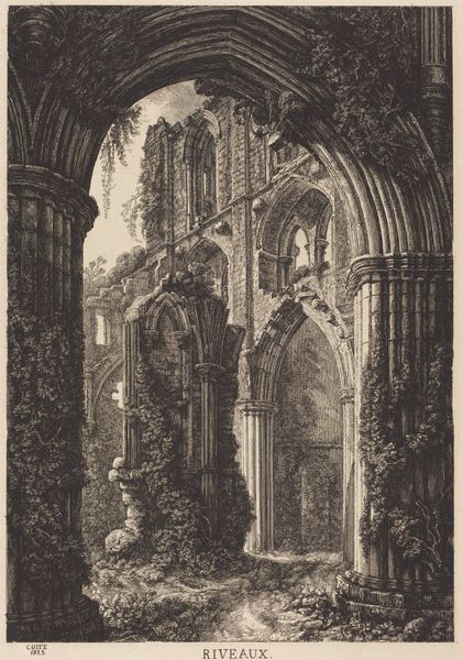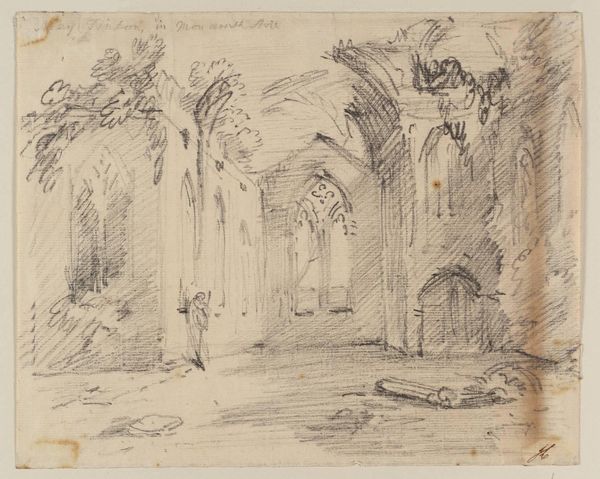 Curator: John Sell Cotman’s pencil drawing, titled "Rievaulx Abbey," captures the sublime ruin with delicate precision. Editor: I immediately sense a mood of melancholy beauty. The skeletal remains of the abbey evoke a powerful image of transience and time's relentless passage. Curator: Absolutely. The dissolution of religious institutions in the wake of the Reformation profoundly reshaped the British social and political landscape, and such imagery of decay became symbolic of lost power and faith. Editor: And the vine-covered architecture presents potent symbols of nature reclaiming what was once strictly ordered and human-made. Look at how the arches and columns are echoed by natural forms. Curator: Cotman's technical skill really shines through. The way he contrasts the sharp lines of the architecture with the soft, organic shapes of the vegetation is striking. It speaks to larger narratives of power, faith, and resistance. Editor: A haunting, evocative image that lingers in the mind. Curator: Indeed, it prompts reflection on the ever-shifting tides of history and the enduring power of visual symbols.
