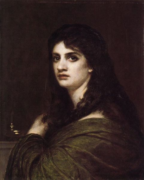 Curator: This portrait by Arnold Böcklin, created in 1863, presents Angela Böcklin as a muse. It is an oil painting that embodies a Romantic and Academic style. Editor: My initial impression is of a reserved composure, almost severe, but softened by the luminous fabric and the cool blue backdrop. It's remarkably balanced in terms of color. Curator: It's interesting to consider the title. By portraying Angela as a muse, Böcklin aligns her with a powerful symbolic role – the inspiration for creativity. The laurel branch she holds, a classical symbol of victory and artistic triumph, further reinforces this idea. What do you see in its symbolism? Editor: The fall of light seems crucial here, look how he articulates the folds and shadows. It gives her presence weight, makes the figure tangible against that rather flat, decorative background. The background almost reads as a patterned screen rather than a space she occupies. It focuses the visual attention solely on the form of the body. Curator: Precisely. Her gaze, directed at the viewer, suggests a level of self-awareness and perhaps a challenge. The rosy accessories soften the portrait with the more stern aspects, and hint towards tenderness as a characteristic of artistic genius. Böcklin, very purposefully, blends classical ideals with a contemporary portrait. Editor: Yes, and notice how the symmetry—or near symmetry—of the composition, along with the restricted palette, contributes to that sense of poised composure. Curator: Considering Böcklin's interest in mythological and allegorical subjects, this portrait offers a personal glimpse into his world, where the muse is not some distant goddess, but someone intimately connected to him. The portrayal transforms the personal into a symbol of creative inspiration. Editor: Analyzing these compositional choices gives access into its deeper artistic ambitions, that is far more rich and layered. The work operates within dualities: warmth and coolness, reality and artifice, stillness and potential. Curator: The symbols invite viewers to see the sitter as more than a simple representation, someone who held real intellectual and inspirational significance for the artist himself. Editor: Seeing the elements function within the painting and also how they affect our perception shifts the art to one of a more personal level for both artist and the observer.