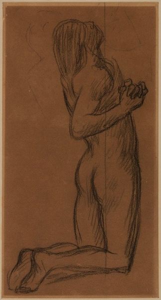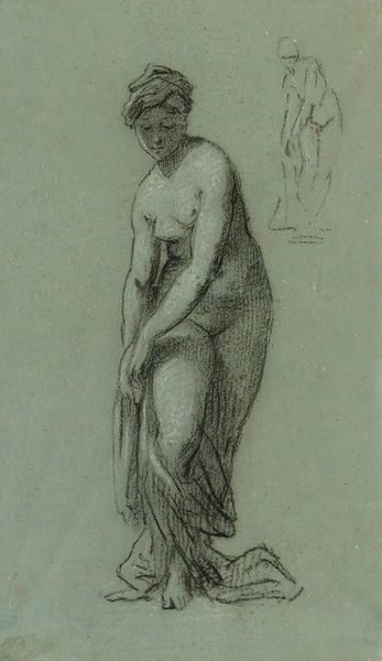 Curator: Looking at this charcoal drawing by Pierre Puvis de Chavannes from 1868 titled "Femme debout", one immediately senses an almost spectral quality to the figure. Editor: Indeed. There’s a haunting vulnerability in the figure's presentation, a standing woman. It’s as though she's caught between worlds, the sketchy lines contributing to a feeling of impermanence and existential searching. Her state of undress hints at the precarious exposure of femininity to an often judgmental gaze. Curator: Precisely. Note the delicate balance achieved through the charcoal medium, with its gradations creating an almost dreamlike aura. It softens the academic pose with a very deliberate and romantic blurring of the form. Look at how the stark contrast accentuates her almost melancholic downward gaze and adds to the symbolic weight of the piece. Editor: It's crucial to also read this drawing in its specific sociohistorical setting. During this time, ideas around women's bodies were intensely policed. Considering this context, there is something defiant in how it uses an academic approach to address female form with a certain intimacy that challenges rigid beauty standards. Curator: A valuable point, although I believe that de Chavannes prioritizes a formal study of form above overt activism. Notice that the gestural lines evoke an ethereal sense. This focus on structure invites interpretation on universal planes beyond mere sociopolitical debates. Editor: I wouldn't necessarily oppose your formal analysis, but it is so important we look through an intersectional lens when looking at images of the body to notice its politics in representation. We must also question who that ideal speaks for and who it erases. Curator: Understood, and these layers of inquiry undoubtedly enrich the complexity we find within a work of such compelling ambiguity. Editor: Absolutely, a fitting reminder that engagement is how we keep our critical analysis expanding!