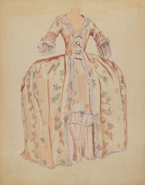 Curator: Here we have Nancy Crimi’s “Dress,” created around 1936. It’s a delicate rendering in pencil on paper. What strikes you first about it? Editor: It feels ephemeral, like a whisper of a dream. The soft pink hue and those layers of delicate ruffles...almost ghostly, as though the wearer has vanished, leaving only the memory of the dress. Curator: That’s interesting! Let's look at its structure: observe how Crimi meticulously outlines the form, capturing every pleat and curve with such precision. Note, too, the small sketches placed next to the primary one on the left, where the back and other details are emphasized. We could spend all day thinking about line weight! Editor: Exactly, there is a deep structural understanding at play here. Yet, beyond the technical, there's an air of faded glamour. The academic style is evident but that touch of subtle colour tells a different story of light and motion in those imagined ballrooms of yesterday! And do you see the little embellishments running all the way down? They evoke a feeling of spring. It is as if there's some type of implicit reference being made to some kind of narrative or myth. Curator: I hadn't thought of a narrative reading but I quite agree about springtime. Given Crimi's focus on fashion, one wonders what occasion this garment was sketched for, and what role Crimi's other works played in influencing design during this time. The composition itself feels like it is about to take flight! Editor: That's wonderfully put! This work almost breathes on the wall, a subtle reminder that clothes often capture the personalities and cultural values of their wearers. They speak of lost generations that nonetheless linger. Curator: And who are also beautiful in their vanishing, or maybe only becoming visible precisely through the veils of memory. Editor: What a harmonious way to regard our world.