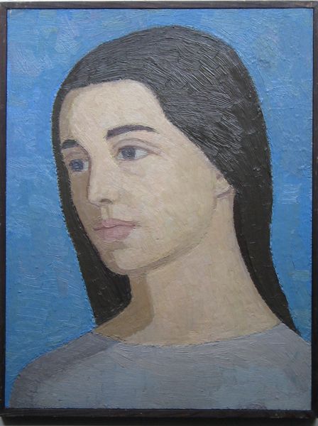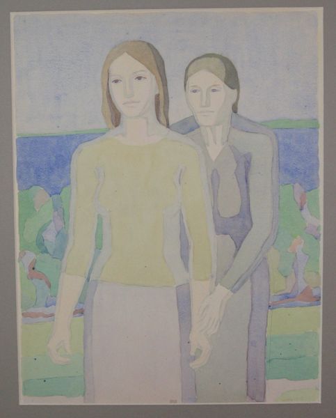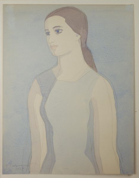 Editor: This is Hryhorii Havrylenko’s "Female Image in Nature," a 1964 watercolor painting. It's such a calming composition; the flat planes of color create a really tranquil feeling. What catches your eye in this portrait? Curator: The first thing that strikes me is Havrylenko's masterful use of simplification. Notice how the artist reduces the figure and landscape to their most essential forms. There’s a flattening of perspective, right? The subject’s features—the nose, the eyes—are rendered with minimal detail, almost geometrically. The background is similar, just sky, water, and land rendered as bands. Editor: Yes, that simplification is so striking. It’s almost child-like in a way, but also sophisticated. The colors too – soft blues and greens – they contribute to that calming feeling I mentioned. Curator: Exactly. And how do these blocks of color interact? There's a subtle tension between the flatness of the picture plane and the suggestion of depth created by the layering of these shapes. Consider the interplay between the pale skin tone of the figure and the surrounding cool tones. It gives the figure prominence without using traditional shading or modeling. Does the limited palette contribute to the overall effect? Editor: Definitely, the muted tones really emphasize the simplified forms. Is it fair to call the lack of heavy brush strokes a feature of its form too? Curator: Yes. There is great control here, wouldn't you agree? Look how precisely each color block abuts its neighbor. This gives a crisp definition which works against any emotional affect. Editor: This emphasis on form and structure has really given me a fresh way to see the work. It's less about "who" the woman is, and more about the arrangement of shapes and colors. Thanks for highlighting the interplay!