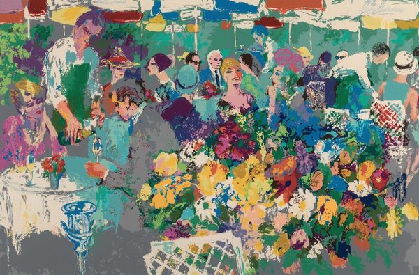 Editor: LeRoy Neiman's "Stud Poker," painted in 1980 using acrylics, explodes with color and energy. The whole scene is a blur, but you can sense the tension and excitement in the room. What underlying stories and cultural moments do you see represented in this bustling image? Curator: For me, it speaks volumes about spectacle and the cultural performance of masculinity. Look at the symbols: cards, chips, cigars. These aren't just objects, they are shorthand for risk, reward, and social posturing that's historically tied to male-dominated spaces. Do you notice how Neiman blurs the line between observation and participation? Editor: Absolutely. There's a feeling that we're not just looking *at* a poker game, but experiencing its intensity firsthand. It reminds me a bit of Degas and his scenes of social life. Is Neiman engaging with similar themes of documenting a slice of modern existence? Curator: In a way, yes, but with a crucial difference. Degas often observed from a distance, whereas Neiman dives right into the sensory overload. The brushstrokes become almost aggressive, echoing the aggressive energy of the game. Think of the poker game not just as a pastime but as a microcosm of societal power dynamics. Consider that poker in particular holds such potent symbols for many people; how else would you express the same emotional or intellectual weight? Editor: That makes me think about how these scenes are portrayed so often in film, not only fine art. They've almost become tropes, referencing something about chance encounters and the 'game of life' as they play out in the human drama. Curator: Exactly! Neiman recognized and amplified those readily accessible associations, imbuing them with a vibrancy that's uniquely his. A key quality for cultural memories. Editor: It's fascinating how a seemingly straightforward scene can unpack so many layers of cultural meaning. Curator: Precisely. Images are rarely ever just "images." They are vessels carrying lifetimes of symbolic meaning and interpretation.