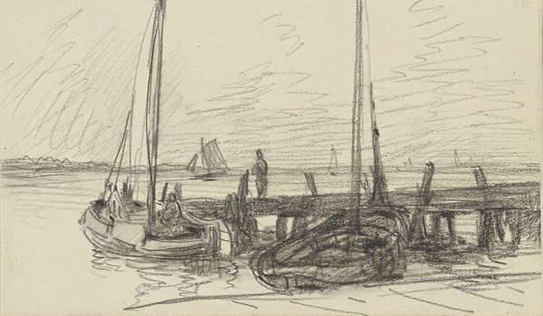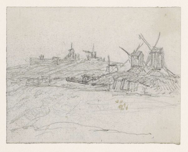 This is a drawing by Willem Witsen, titled ‘Molen Rijn en Lek te Wijk bij Duurstede’. The drawing presents a landscape dominated by a large windmill to the left, its form rendered with dense, expressive marks that convey volume and texture. The composition is structured around the contrast between the solidity of the mill and the fluidity suggested by the horizontal strokes indicating water. Witsen employs charcoal to explore tonal variations, creating a sense of depth and atmosphere. The drawing might be read as an exploration of how industrial structures intersect with natural environments. This invites a semiotic analysis, where the windmill functions as a signifier of Dutch identity and technological progress, juxtaposed against the organic forms of the trees on the right. Ultimately, the drawing challenges a singular interpretation, engaging the viewer in a visual dialogue about the dynamic interplay between nature and industry.