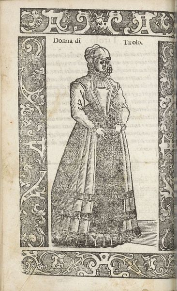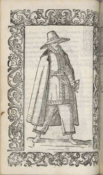 This is an engraving by Christoph Krieger titled "Mercanti Napolitani moderni". Here, form and texture combine to present a figure enclosed within an ornate, decorative border. The use of fine, precise lines creates detailed textures, from the fabric of the merchant's clothes to the intricate designs of the border. The composition emphasizes balance and symmetry. The figure stands centrally, flanked by the elaborate border which frames the scene and focuses our attention. The details in the merchant's attire, such as the folds of his cape and the embroidery on his sleeves, add depth and richness to the image. This close attention to material detail invites us to consider the semiotics of clothing and social status. The border, with its repeating patterns and stylized motifs, functions as a visual code which contextualizes the figure within a broader cultural narrative. Ultimately, the engraving challenges fixed notions of identity by layering visual codes through form and representation.