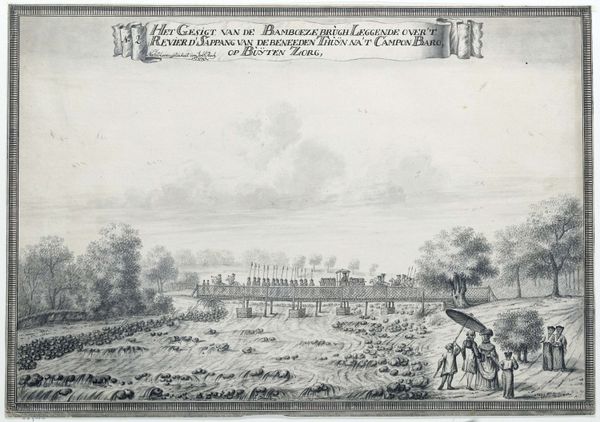 Curator: Here we have Johannes Rach’s “Het Gezigt van Indramago boven Beuijtenzorg binnen op t' Pleijn, met desselfs Speelheuijs, Water Fonteijne en Bruggen,” created in 1770. It's an engraving depicting a Dutch East India Company outpost. Editor: The scene feels incredibly ordered, almost like a stage set. The tiny figures are meticulously arranged. I wonder about the power dynamics at play within this constructed space. Curator: Indeed. Rach documented scenes for the VOC, and this is likely Indramayu, near Buitenzorg, now Bogor in Java. Notice the precise lines and detailed rendering. Engravings like this were crucial for disseminating information about colonial holdings. Editor: And what information were they meant to convey? The placid order? The control of the landscape? The seemingly docile local population? The careful distribution of shadow emphasizes how the composition isn't just descriptive, it’s prescriptive, an assertion of power. The symmetry further suggests an imposed structure. Curator: The 'Speelheuijs,' or "play house" implies leisure, which would likely have been a symbol of wealth and control for the Dutch. Also, this area had significant economic importance, with indigo and other crops fueling global trade networks. Editor: I think it’s critical to look closer at who's missing. This image erases so much – the violence inherent in colonization, the displacement of indigenous people, and the exploitation required to create such "leisure." How did Rach's role contribute to sustaining a system of inequality? Curator: These images certainly played a role in shaping European perceptions and reinforcing colonial narratives. They served as propaganda. It is worth noting that there is considerable local Javanese labor visually apparent. Editor: Absolutely. And how complicit were European artists in romanticizing oppressive structures? Whose narratives are prioritized when works like this get reproduced and circulated? This forces us to examine the politics embedded within landscape art itself. Curator: This print, presented almost as an architectural document, gives insight into Dutch colonial aspirations and how those aspirations affected people and space. Editor: The legacy of this piece remains relevant. These images helped to solidify colonial ideologies. It is important for us to remember that their narratives can still shape the present if left unexamined.