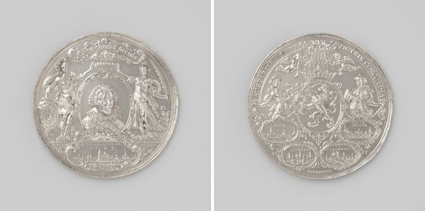 Nicolaas van Swinderen created this silver reward medal, or "Beloningspenning," for the States General of the Netherlands, although the exact date is unknown. The medal is covered in heraldic imagery relating to the political and economic structures of the Dutch Republic. Lions and crowned shields assert the power of the Dutch state. The Latin motto "Concordia Res Parvae Crescunt" translates to "Through harmony small things increase", a reference to the strength of the Republic that was established in the 16th century. Such reward medals were often bestowed upon individuals who made significant contributions to society or demonstrated exceptional service to the state. The medals served not only as symbols of personal achievement but also as visible affirmations of the values upheld by Dutch society. Art historians rely on archival documents, period publications, and other material evidence to contextualize objects like this. By doing so, we can gain a deeper understanding of the complex interplay between art, society, and politics.