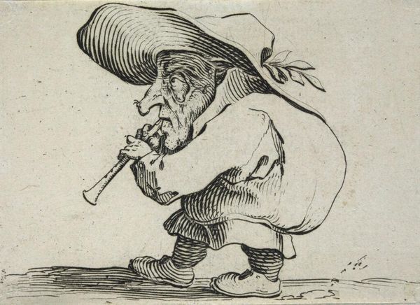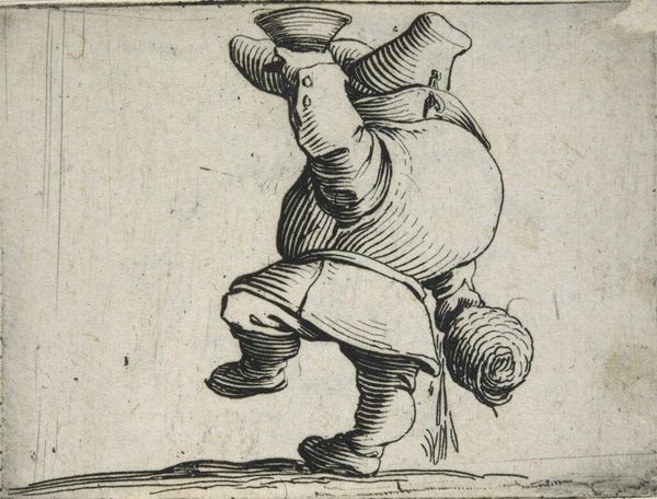 Editor: Right, so here we have Jacques Callot's etching, "Drinker Seen from the Front." I find him so jovial; he’s definitely enjoying himself. What strikes you when you look at this, um, little reveler? Curator: The pure, unadulterated joy, perhaps, the way he almost floats! Callot was a master of capturing the spirit of everyday life, you know? It’s a tiny etching, but it contains a whole world. Editor: So, is it just the everyday? Or do you think it's making a statement? Curator: Maybe a little of both! Callot often explored the fringes of society. Is he celebrating simple pleasures, or critiquing excess? It's wonderfully ambiguous, don't you think? Gives you pause to ponder. Editor: I hadn't thought of it that way, as critical. I see it now. Thanks! Curator: Exactly! Art opens our eyes, shifts our perspective, one little etching at a time!
