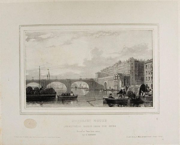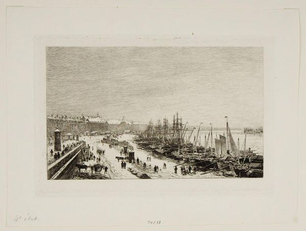 Curator: This is George Cooke's "Naples from the Mole," a piece with an immediate sense of subdued grandeur. Editor: Yes, the monochromatic palette lends a melancholic feel, almost like a memory fading into sepia. Curator: Note how the linear perspective directs the eye towards the distant fortress; it masterfully captures the architectural details and the city's structure. Editor: And yet, there's also the tension between the romanticized view of the city and the reality of the bustling port, likely filled with socioeconomic disparities. Curator: The artist's technique certainly emphasizes the aesthetic qualities, the play of light and shadow defining forms, minimizing overt social commentary. Editor: But art cannot exist in a vacuum; Cooke's choice to depict this scene, this particular vantage point, certainly reflects a specific, likely privileged, perspective. Curator: I see it as a beautiful composition of tonal values. Editor: I appreciate the scene, but I always want to know who's in the frame—and who's left out.