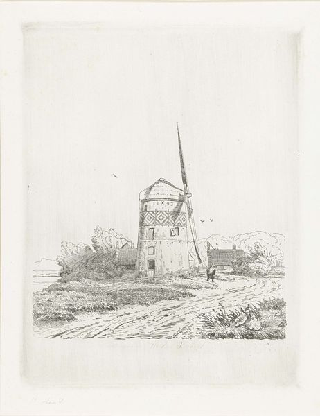Curator: Immediately, this engraving titled "Buitenhuis met toren", or "Country House with Tower", dating back to the 19th century, strikes me as melancholic. The etching is by J.H. Pluygers and rendered in ink, a drawing, or perhaps a print, showcasing this quaint structure amidst a serene landscape. Editor: Melancholic, yes, but also deeply unsettling. There is a precarity here, in the leaning fences and the ungainly additions made to the main structure of the house. It’s almost as if the owners have no faith in the architecture, that this add-on will hold against the sands of time. Curator: It does appear timeworn. But notice how Pluygers captures the textures with such clarity using only lines, it’s architectural. What emotions are stirred by this tower for you? I can’t decide if the artist is celebrating it, or pointing out its folly. Editor: For me, towers often symbolize aspiration, reaching for the heavens, for freedom. But this tower seems somewhat isolated from any societal structure, even the community structure of its era, with this rough exterior. It seems very vulnerable and lonely. Are those platforms crumbling around it, halfway up? The drawing seems to suggest that perhaps, what they yearned to achieve was perhaps more tragic and isolating in reality. Curator: Indeed, those platforms, they are rather roughly-hewn. Yet perhaps they reveal resourcefulness too. To me, they are testament to the era and the people who made their mark upon the world and these spaces. Editor: That’s valid too. How fascinating that the human capacity for creation can evoke two emotions at once – aspirations mixed with foreboding. The contrast and layering gives the print an energy that pulls you in. Even if its symbolism does unnerve you. Curator: Precisely! There is beauty in its starkness, a reminder that even in isolation, human spirit leaves its indelible mark. It is this tension and raw texture which gives the piece such life and which reminds me so clearly of human continuity. Editor: Absolutely, this feels more than a cityscape drawing; it’s a meditation on ambition, on isolation, on our attempts to build and to leave our mark, for better or worse. It compels conversation beyond art history and brings important topics like aspiration and reality to light.