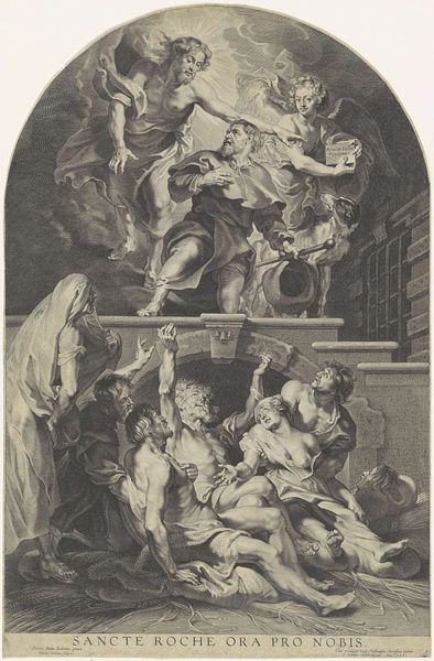 This print, "Maria draagt heilige Franciscus van Assisi voor aan Christus," was made by Boëtius Adamsz. Bolswert. It is an engraving, meaning the artist used a tool called a burin to carve lines into a metal plate, which was then inked and printed. The density of lines creates a full tonal range, from the bright luminescence of Christ to the deep shadows in the lower register. Engraving was a highly skilled, labor-intensive process, often used for mass-producing images for religious or educational purposes. The fine lines and precise details made possible by engraving allowed for intricate compositions and subtle gradations of light and shadow. Engravings like this one played an important role in disseminating religious ideas and imagery. It also offered Bolswert a way to make a living by reproducing images for a broad audience, connecting artmaking to the wider economy of printmaking. Considering the material and processes used in its making can help us appreciate the full social and cultural significance of this artwork.
