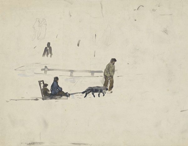 Curator: Good morning. Today, we're looking at "Open Sea off Haikko, study for Boys Playing on the Shore" created by Albert Edelfelt in 1884. Edelfelt, a Finnish painter, captures a moment of tranquil observation in watercolor. Editor: It’s… unusually subdued, isn’t it? Almost monochromatic. The eye travels between those large, angular rocks, the vague reflection on the water, and the ghostly suggestion of the land on the horizon, yet there's so little contrast or saturation. The entire image feels as though it's rendered on the verge of vanishing. Curator: Indeed. While Edelfelt is known for his vibrant depictions of Finnish life and society, here, the restraint in palette draws attention to form and composition. It’s worth remembering that it's a study, an exercise, if you will, for a larger painting. The brushstrokes are quick and deliberate, laying the foundation for a more elaborate finished work. Editor: I’m intrigued by the strategic positioning of the rocks. Notice how they establish this visual rhythm, almost a deliberate arrangement from left to right. What are the semiotic elements at play? One could read into how the interplay between water and stone evokes certain philosophical arguments on impermanence and the persistence of the material world. Curator: It's interesting you pick up on that, since this was made at a pivotal point in Finnish art. The late 19th century witnessed the rise of landscape painting, capturing Finland’s national character and sense of identity under Russian rule. Haikko, a coastal region, offered endless possibilities for artists like Edelfelt to explore these themes of place and belonging in social life. The finished painting featured playful figures, transforming the somewhat brooding landscape into an intimate vignette of middle class leisure. Editor: Perhaps Edelfelt also suggests themes of control, or lack thereof. He guides the viewer across the surface via pictorial components like tonality and texture while ultimately conveying that any imposed meaning risks being engulfed by the work’s watery expanse. The effect is of both surface and depth. Curator: It’s tempting to interpret through a sociopolitical lens or, conversely, formal values, though I am reminded that even a seemingly understated painting such as this holds multiple layers for interpretation. Thank you for your insights. Editor: And thank you. Viewing this through its materiality as an early impression of its kind has been fascinating.