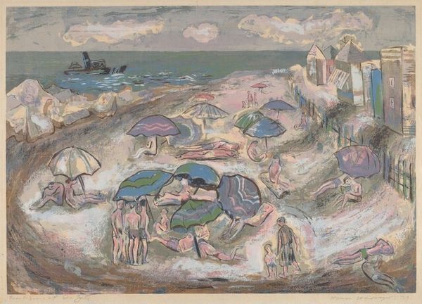Curator: Oskar Kokoschka, born in 1886, painted this piece, titled "The Crab" at an unknown date. It is currently held in the Tate Collections. Editor: It’s visceral. The thick impasto almost makes the scene feel alive and writhing, doesn’t it? The crab seems both menacing and vulnerable. Curator: Kokoschka often explored themes of psychological turmoil and existential anxiety in his work. The crab, a symbol of the unconscious, can be seen as representing hidden fears and desires. Editor: Look at the way the human figures are dwarfed by the landscape and the crab. It suggests the overwhelming power of nature, perhaps even our own internal nature. Curator: Indeed. Kokoschka's expressionistic style, with its distorted forms and jarring colours, reflects the unease of the interwar period. His work often critiqued societal norms and exposed underlying tensions. Editor: It feels like a Jungian dreamscape, doesn't it? Curator: I agree. It's a powerful piece that invites reflection on our place in the world. Editor: Yes, it's a raw and honest portrayal of human experience.
