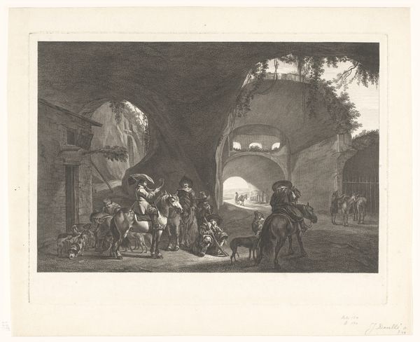 Curator: This is "Binnenplaats" a genre-painting from the period 1831 to 1897, created by Martinus Antonius Kuytenbrouwer, Jr. The Rijksmuseum holds it in their collection. As the labels describe, it is a print done using engraving techniques. Editor: Immediately, the scene's architectural enclosure evokes a sense of contained power, yet there's an everyday languor to the figures that's quietly compelling. It’s almost a theater stage, set back in time. Curator: I think that perception is especially potent given how Kuytenbrouwer composes with stark contrast. The foreground is shrouded in deep shadow. Emerging into sunlight in the distance, the suggestion is to advance from darkness toward enlightenment. Do you feel it embodies a moral quality? Editor: The image really poses questions about safety and governance within urban space, not necessarily morality. The figures carrying weaponry certainly introduce themes around security, power dynamics, and potential conflict. We’re positioned as outsiders, watching an inner world of some kind. I would love to learn about class tensions present in Amsterdam at that moment. Curator: I find it is how Kuytenbrouwer repeats the shape of the arch that holds my interest. It appears again as a city gate deep within the pictorial plane. These arched passageways appear again and again across cultures—doorways to understanding life’s journey—birth, death, and rebirth as initiatory passages. The arch has an age-old symbolic force. Editor: Those kinds of archways are deeply woven into European city design as much as into our cultural imagination. They’re framing structures that determine who belongs and who doesn’t. The composition focuses the eye precisely at the point of enclosure and exclusion. What strikes you about this interplay between private and public space? Curator: Ultimately, I feel that such contrasts prompt deep, almost unconscious associations with a sense of order and transition. The interplay between light and shadow is a symbolic vocabulary. The arch serves as more than architecture here, representing more timeless themes of human transformation. Editor: Yes, those transitions invite critical inquiry. Even from an early time in image creation, artists used printmaking techniques as means for mass distribution of their viewpoints and agendas to large audiences. The nuances invite a kind of probing speculation that helps the past reflect usefully on the present.