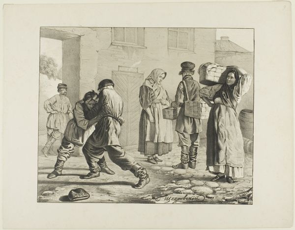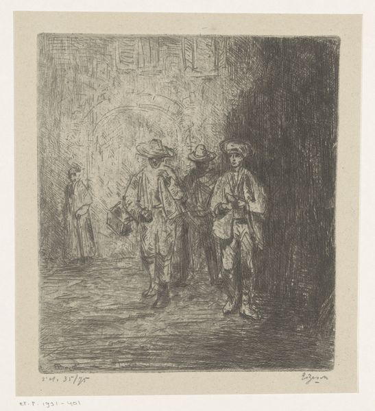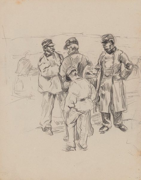 Curator: Looking at this, I feel like I've stumbled into a muted dream. Editor: Indeed. We're looking at "Soldaten en burgervrouw in legerkwartier tijdens de Eerste Wereldoorlog," a work from 1917 by Théophile Alexandre Steinlen. It appears to be a print, possibly using pencil or a similar drawing medium. Curator: There's a tenderness, almost a vulnerability to it, especially in the way the figures are sketched. Not posed, but… captured. Editor: Right, the informality draws us in. Steinlen created this during World War I, a time when, through press and propaganda, nations idealized their own soldiers. How do you see this composition fitting in at this time? Curator: The presence of the civilian, that woman...she complicates things, doesn't she? She represents the world they are supposedly defending, but the drawing seems to emphasize their shared humanity. She brings an element of grounding amidst the war. It feels melancholic. Editor: Melancholy perhaps stems from the war's societal impact, which is where Steinlen makes a commentary. His work brings out how civilians struggled. During this period, we know civilians often faced displacement and shortages as the war machine requisitioned resources. Curator: Exactly. She’s not just a passive figure, either. She’s exchanging something—goods, information? There's an economy of survival happening right there, on the ground. This interaction is something you wouldn’t normally see from traditional propagandist depictions of war. Editor: The lines around their faces create this effect: they’re all experiencing similar hardships. Their expressions feel real; reflecting a common experience. How do you see this image speaking to modern audiences today? Curator: We’ve become wary of heroic portrayals. This work strips away any sense of glory to highlight human bonds amid chaos. That remains perennially relevant. War touches everyone. Steinlen helps us confront that shared burden. Editor: Absolutely, and perhaps it’s the drawing’s unfinished quality, its sketch-like nature that amplifies this. A photograph may solidify the moment in time but with its looser depiction of subjects, Steinlen's composition offers more introspection and more relevance. Curator: This drawing feels like a gentle nudge, urging us to consider the human cost of grand narratives, the importance of small kindnesses, and the silent resilience of ordinary people. Editor: Very well put, it's the intimacy he conveys of people persevering in a setting that continues to resound beyond its initial moment in time.