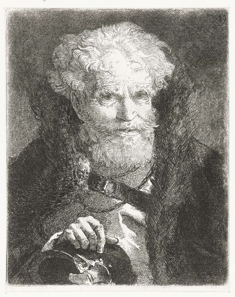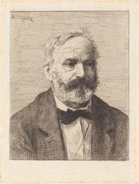 Curator: This is Giovanni Boldini’s striking 1886 oil on canvas, a portrait of the celebrated composer Giuseppe Verdi. Editor: Immediately, I'm struck by the subdued palette and the weighty stillness. There’s something almost photographic about it, but softer, imbued with the artist's touch. Curator: Indeed. Consider how the somber background intensifies the textural details of Verdi’s beard and the sharp tailoring of his dark jacket. Boldini masterfully utilizes light to sculpt form, paying close attention to how the oil paint can mimic fabric and age. Editor: The choice of a muted palette, though, feels significant. What kind of black was used? Was it carbon based? Is it manufactured through any exploitative means, like ivory black for instance, that reflects or rejects the artistic ideals for this portrait? Also, look at the size of Verdi's hands here - they are working hands. We understand a different story when labor, production and class are examined. Curator: It pushes our perceptions of portraiture, as it shows not just who Verdi was, but what he represented within the late 19th century. His eyes project experience, insight, and maybe even the weight of operatic tragedies. And consider how the brushstrokes build a certain drama around his face, almost a parallel to the crescendo in one of his operas. Editor: I agree on the mastery of the painter and the portrayal, but for me, I wonder, what kind of studio Verdi was sat in? What social structure was implicit with being in Boldini's art space and engaging in the upper echelons of society in that time? I find that even in its seeming simplicity, this artwork embodies a network of socio-economic circumstances in that specific moment of artistic capture. Curator: Perhaps both, the aesthetic construction of persona and material existence can enhance each other when observing this stunning and beautiful piece. Editor: Indeed. Each brushstroke on this canvas invites layers of understanding, echoing a society on the precipice of modernity.