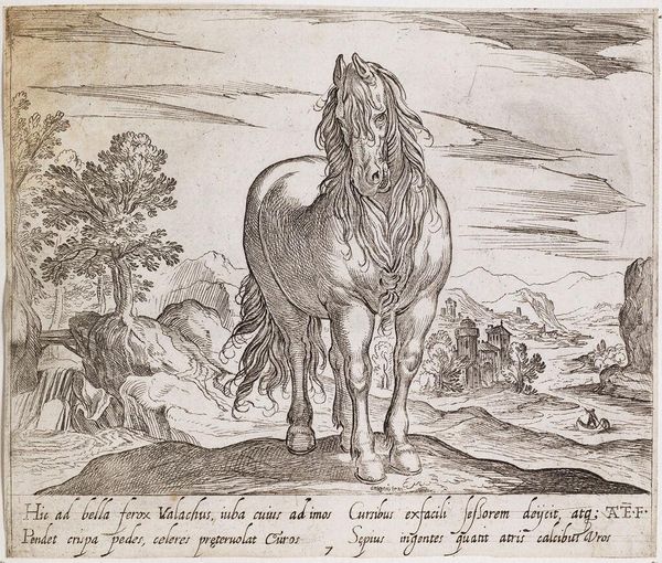 Curator: This is Antonio Tempesta’s “A Horse Tethered to a Stump.” The composition feels so still, doesn’t it? A monument to equine power, meticulously rendered in monochrome. Editor: Yes, there's a strange quietness. I see this as an emblem of the aristocratic use of horses, where the landscape merely serves as a backdrop to showcase wealth. Curator: The way Tempesta uses line to define form and texture is remarkable. Note the musculature, and how each hair of the mane catches the light. Editor: But that very precision seems to limit its impact. Is this not simply an equestrian trope, reinforcing social hierarchies through idealised representation? The horse becomes a symbol of dominance. Curator: Perhaps, but the artist also captures a moment of rest, a pause. The animal's weight is palpable, its presence commanding. Editor: I agree, it's a snapshot reflecting the societal role of animals, and how art was involved in shaping perceptions of status and control in that period. Curator: Indeed, a fascinating lens through which to examine both artistic skill and cultural values. Editor: Yes, and it gives us some perspective on the ongoing conversations about class and power.
