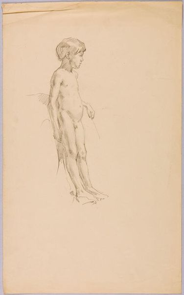 Curator: The artwork before us is Giles Hussey's "Apollo Belvedere," a pencil drawing from the 18th century. Editor: It’s ghostly! The pale figure seems to float off the page; there's a distinct lack of density. Curator: Precisely. Hussey was quite interested in developing proportional systems; notice the inscription mentioning a "Machine to take the Ease of Proportion." This piece reveals his intense focus on the mechanics of representation. Editor: So, less about divine beauty, more about the construction of ideals? I wonder how this focus intersects with the social structures of the time, the inherent biases in defining "ideal" forms, especially a male nude. Curator: I think you're right to push us to consider the power dynamics at play. Hussey’s drawing, in its very process, reflects the act of dissecting and categorizing beauty. Editor: It certainly gives me a lot to think about regarding the historical context of beauty standards. Curator: Indeed, and it invites us to consider how such ideals continue to affect our understanding of the human form.