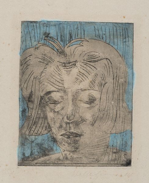 Curator: Here we have Walter Gramatté’s "Tired Man (Self-Portrait)," a 1923 drawing crafted with ink on paper. Its emotional weight is palpable from the first glance. Editor: Absolutely. The first impression is almost overwhelmingly one of resignation. The bowed head, the closed eyes… there's an undeniable weariness etched into the very lines. Curator: Note the almost brutal honesty of the marks, the stark lines creating the figure. It’s a study in economy; the artist distills emotion to its most elemental form. We could examine, for example, how the artist creates definition through contour and repetition. Editor: Those eyes! They are not merely closed; the artist has rendered them almost unnaturally sealed, underscored by a dark, evocative shade of red. This evokes deep sorrow, or perhaps a shutting out of the world. Red as a color is heavy with symbolic meaning. What resonates to me is the raw, almost painful introspection. Is this figure just physically tired, or is there a spiritual exhaustion at play? The post-war context would certainly suggest a broader societal fatigue. Curator: Indeed. Furthermore, we can see how Gramatté uses layering to generate depth, particularly in the face and against the otherwise undifferentiated dark field. The strategic deployment of cross-hatching yields not only visual interest, but also enhances the tactile quality of the work. Editor: I’m interested in the way the dark background seems to press in on the figure. It amplifies the sense of confinement. It isn't a neutral space; it feels heavy with unseen forces. Is it meant to be understood as societal pressure or perhaps something more internal? The overall somber palette pushes that interpretation further, guiding us toward melancholic contemplation. Curator: In that sense, form and symbol coalesce, rendering the work so compelling. Editor: Precisely. Gramatté invites us to recognize fatigue not merely as a personal experience, but as a shared emblem of a specific time and maybe all times, now imprinted on visual memory.