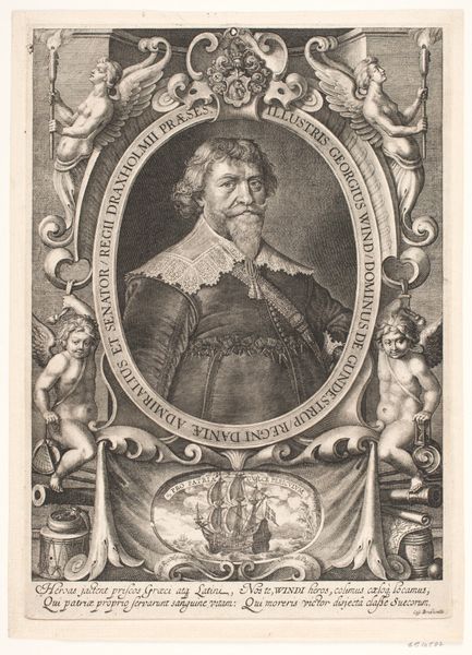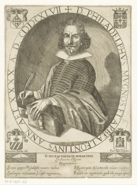 Cornelis Nicolaus Schurtz made this print of Johannes Agricola II in 1638. It presents Agricola at 49 years of age. It's fascinating to consider the social standing that portraiture, especially in print form, conveyed in the 17th century. Agricola, holding what appears to be a alchemist's flask, is presented as a figure of learning and status, denoted by his clothing. This image creates meaning through references to science, knowledge, and social standing. Made in the Netherlands, a hub of intellectual and artistic exchange at the time, this print reflects the growing importance of the individual and the rise of scientific inquiry. Understanding this artwork requires considering the social and institutional contexts in which it was produced. What was the role of scientific societies? How did images circulate and contribute to the construction of public figures? These are questions we can begin to answer through archival research and historical analysis, allowing us to appreciate the intricate connections between art, society, and the individuals who shaped them.