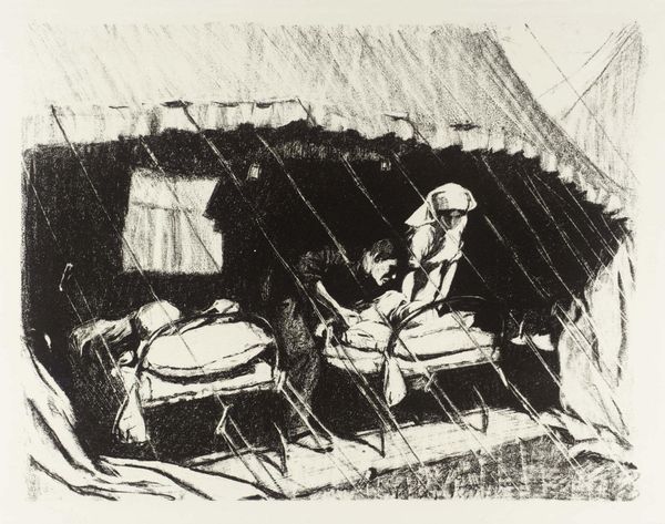 Editor: This is Peter De Francia’s drawing, "The Port of Genoa," created in 1952. It’s a charcoal work, and I’m struck by its almost documentary feel, capturing a scene of everyday life. What stories do you think are embedded in this piece? Curator: The figures, rendered with such simple lines, are almost archetypal. Notice the elevated position of some figures versus the dwellings below. What do you think that visual hierarchy communicates about power, or perhaps vulnerability, within the community? Editor: I hadn't considered the power dynamics. The figures on the "rooftop" now feel more like observers, detached. Curator: Precisely. Consider also the recurring motif of shelter – the roofs, the implied safety. It evokes a sense of both refuge and impermanence, reflecting perhaps the post-war anxieties of displacement and rebuilding. Do you see that reflected in the medium of charcoal itself? Editor: Yes, the charcoal feels transient, like a fleeting moment captured, not a permanent statement. I’m beginning to see more than just a port scene now. Curator: Indeed. It reminds us how even seemingly simple images can hold layers of cultural memory and emotional depth, if we are willing to look closely. Editor: Absolutely. This piece has definitely given me a fresh perspective on how to analyze art beyond the surface.