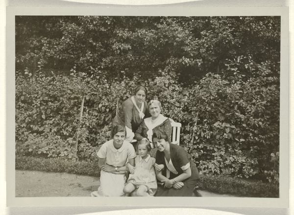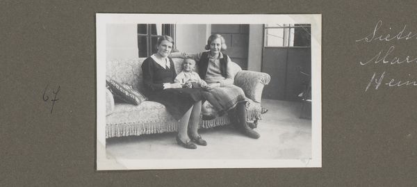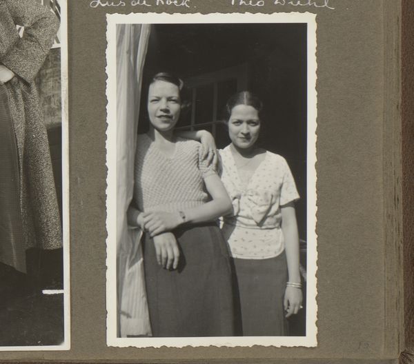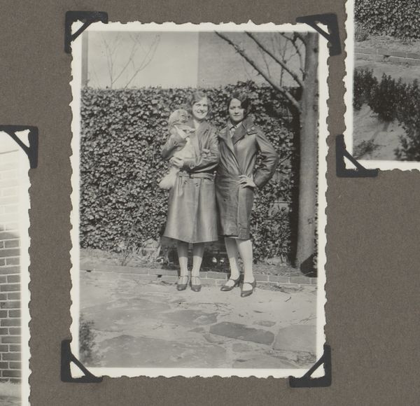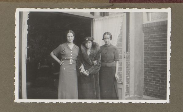 Editor: This is a black and white photograph, created sometime between 1930 and 1935. It is entitled “Corry Mak van Waay-Zulver, Wilhelmina van Zijll de Jong en Henriëtte Wassink.” It looks like it was pulled right out of a family photo album. What do you see in this group portrait? Curator: Immediately, I'm struck by the performativity of identity within the confines of the domestic sphere. Notice the careful arrangement of these women, likely friends, within this seemingly candid shot. How do their poses and attire challenge or reinforce societal expectations of women during the interwar period? What narrative are they trying to construct? Editor: I hadn’t really considered that. I just saw it as a regular snapshot! Curator: Well, consider the social and political landscape. Women were pushing boundaries, seeking greater autonomy. The flapper style, although present, is subtly toned down. The woman holding the dog in particular presents an almost masculine assertiveness in the gaze that goes beyond the simple portraiture we see in paintings of the time. Do you think this is purely accidental, or could it be deliberate self-representation? Editor: Now that you mention it, they do seem like they’re trying to convey something beyond just a casual portrait. Almost like, quiet rebellion? Curator: Precisely! It prompts questions about the nuances of female friendship, the subtle subversion of gender norms, and the importance of visual culture in understanding the lived experiences of women during this pivotal time. This photo invites us to reconsider mainstream historical narratives by amplifying the voices and visual agency of those often overlooked. Editor: I'm now looking at this photograph with completely different eyes. I am not even thinking about whether I like it but what message is trying to send. Curator: And that shift in perspective, that’s the power of situating art within its broader cultural context.