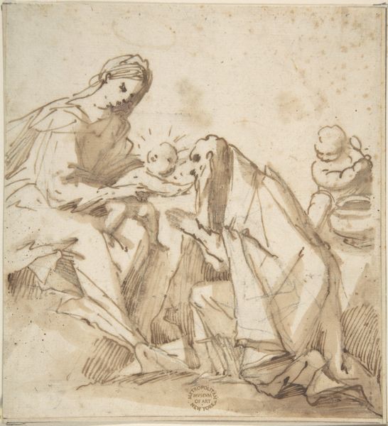 Curator: This sketch, titled "Pietà," is attributed to the School of Anthony van Dyck and resides here at the Harvard Art Museums. It's rendered in pen and brown ink with gray wash on paper. Editor: It's incredibly raw, isn't it? The stark lines and somber wash really underscore the grief and vulnerability depicted. Curator: Absolutely. Think about the socio-political context. Religious iconography often served as propaganda. This image, devoid of overt grandeur, presents a different narrative, one focused on human suffering. The Virgin Mary, the embodiment of maternal loss, becomes a potent symbol of resistance against oppressive structures. Editor: The material handling really drives that home. The roughness of the sketch, the visible labor in each stroke—it avoids any sense of idealized perfection. It connects with the viewer on a more visceral level through its immediacy. Curator: Precisely. By focusing on the raw emotionality, the artist challenges traditional power dynamics inherent in religious art. It’s an invitation to empathize, to question, and perhaps, to act. Editor: It’s a potent reminder that even the most familiar narratives can be powerfully reinterpreted through a focus on material and process. Curator: Yes, a testament to art's ability to challenge the status quo, even within established frameworks.
