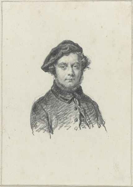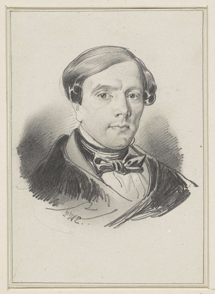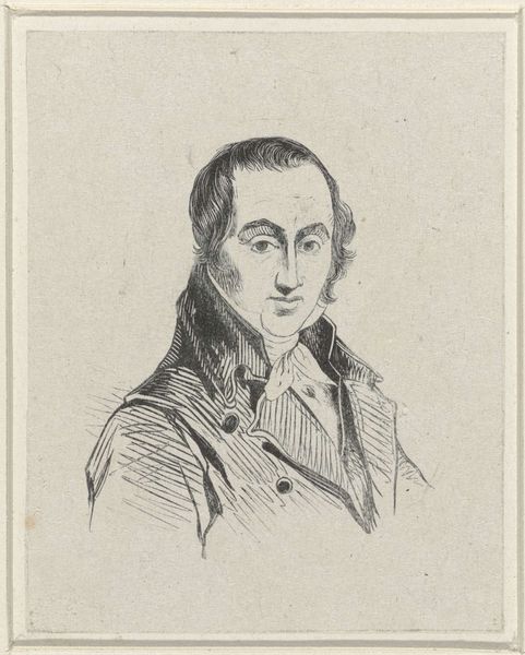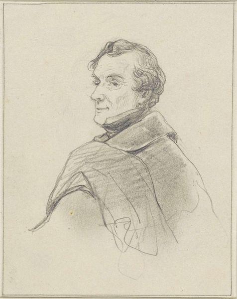 Curator: Up next, we have a portrait rendered in pencil from around 1841-1842. It's a portrayal of Aloysius Geefs. Editor: The initial impression is one of quiet contemplation. The delicate lines lend a certain vulnerability to the sitter, even with his formal attire. Curator: Indeed, Aloysius Geefs was a prominent Belgian sculptor. Considering his profession, what do you make of his choice to be rendered in such a simple medium? Editor: Perhaps it speaks to the Romantic ideal of inner character. The artist focuses on the man himself rather than any external indicators of his status. Note his head covering and loosely knotted neck scarf which, even in its informality, suggests the man beneath the sculpted exterior, if you will. Curator: Good point. There is also a strong link to be drawn between the visuality of drawings such as this and Romanticism, which emphasized emotional intensity. As well as individual subjectivity over the Neoclassical focus on objective reason, particularly within academic art circles of the era. Editor: You can see this focus echoed through his eyes, filled with intelligence and, perhaps, a touch of melancholy. It is striking, especially juxtaposed against the geometric hatchings delineating the shadows around his coat. He seems self-aware, conscious of his position. Curator: It is interesting to view portraits, such as this one, outside their immediate socio-cultural moment, though. Geefs’s prominent family would've made access to formal portraiture fairly easy to procure; and yet here is a relatively rudimentary sketch. We often find a narrative in what does not fully make it into art history's archives. Editor: It prompts us to think of the different modes of perception as we approach individuals and how, sometimes, a softer, simpler image communicates volumes. It shows his creative and professional origins, somehow. Curator: I agree, there's a sincerity conveyed through the art that speaks across time, echoing the humanity within the historical figure. Editor: Precisely; it is always in visual memory and material culture, offering the best starting points for unlocking art history's various intricacies.