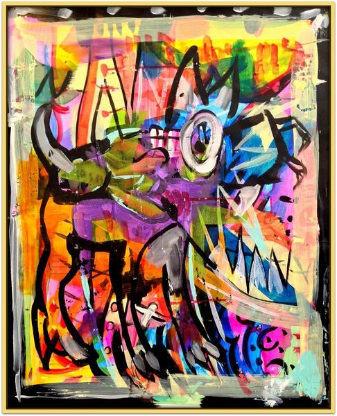 Editor: We’re looking at “Snapper Bill” by David Michael Hinnebusch, created in 2017. It’s a very busy piece, isn’t it? The chaotic composition immediately draws your eye all over the canvas. There is an interesting use of color here with pops of bright colors mixed into the canvas. How do you approach analyzing something with such a complex structure? Curator: The dynamism is indeed compelling. Let us consider the interplay of its formal elements. Observe the juxtaposition of vibrant and muted colors. This contrast creates a visual rhythm, guiding the eye through the network of lines and shapes. Editor: The circles are also interesting as well and appear repeatedly, giving the piece some flow, don’t you think? Curator: Precisely. Consider these circles not merely as shapes, but as structural units contributing to the overall cohesion. Note their placement, how they intersect, overlap, and interact with other elements to create a sense of depth and movement. It is crucial to also study the quality of lines and their weight distribution to understand how the artist distributes emphasis and hierarchy through visual means. What are your thoughts regarding its structural harmony, if any? Editor: Harmony seems to be deliberately disrupted here. It almost feels like the artist is trying to create tension through the overlapping forms and clashing colours. Is that something that contributes to its overall effect, do you think? Curator: It introduces a dialogue. By creating a visual tension through disruptive harmony, the artist elicits engagement, inviting interpretation based on structural components that evoke the raw aesthetic power of a chaotic and unsettled disposition. Do you notice that the bright, saturated colours are placed centrally, drawing attention and serving as key features? Editor: Absolutely, the deliberate placement adds another layer to its visual communication. It's fascinating how analyzing the formal elements alone can reveal so much about the artist's intent, even in what appears to be a chaotic work. Curator: Indeed. Close visual analysis, attuned to theoretical implications, unlocks layers of understanding within a work of art. This detailed attention is rewarding.