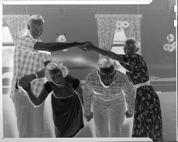 Curator: We're looking at an Untitled photograph by Martin Schweig, presenting an old couple posed by a piano in their living room. Editor: Ah, it feels like a ghostly memory! The stark contrast gives an otherworldly vibe, as if they’re figures from a forgotten melody. Curator: Precisely. The composition is meticulously arranged—the couple, the piano, even the furniture are all carefully placed to construct a visual narrative. The negative image heightens the tonal balance between the subjects and the room. Editor: I wonder what tune that piano holds. There's a quiet dignity about them, a story etched into the very fabric of their clothes. Curator: Indeed. The formal symmetry speaks to a stability, a balanced relationship mirrored in the structured arrangement of the objects around them. Editor: It's like peering into a time capsule, isn't it? A reminder of lives lived, of moments suspended in time. Curator: It leaves us contemplating the layers of existence captured in a single frame. Editor: A quiet, reflective piece that whispers rather than shouts, leaving you with a lingering sense of nostalgia.