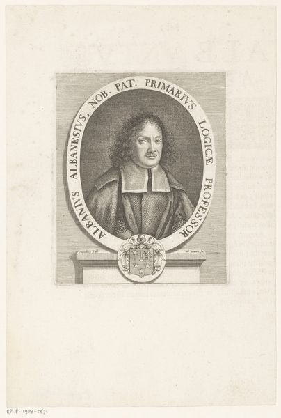 Martial Desbois created this small portrait of Joseph Carlottus, Canon, using engraving techniques. The most striking element is the use of geometric shapes, especially the contrast between the oval frame and the rectangular base, which creates a structured yet dynamic composition. The portrait of Carlottus is meticulously detailed, from the lines that define his face to the intricate patterns of his clothing. Desbois uses line and form not only to depict Carlottus but also to engage with the philosophical context of the time. The inscription around the oval, rendered in precise lettering, functions as a signifier, rooting the image in a specific intellectual milieu. Consider the interplay between the personal and the formal—how Desbois balances the individual likeness of Carlottus with the symbolic weight of his office and intellectual pursuits. The geometric frame and the ordered text suggest a world governed by reason and structure, which was central to philosophical discourse during the 17th century. This print, therefore, functions as both a portrait and a statement about the subject's place within a structured universe of knowledge and order.