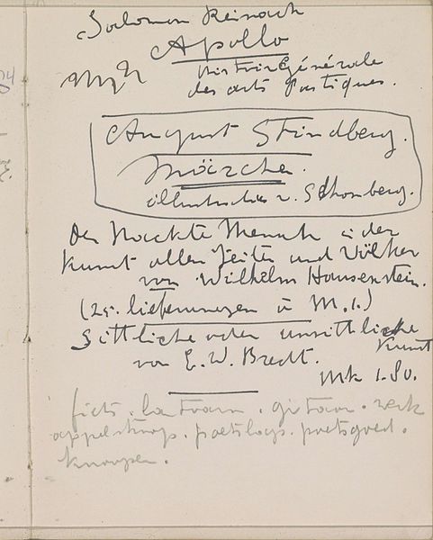 Editor: Here we have "Notities," created around 1916 by Reijer Stolk. It's a mixed-media drawing, a page from a sketchbook it seems, filled with handwriting and notations in graphite, pencil and other media on textile or paper. It’s got such an intimate feel, like we’re peering into the artist’s private thoughts. What strikes you about it? Curator: It’s fascinating how a simple page of handwritten notes can become a cultural artifact, isn’t it? To me, the act of handwriting itself carries immense symbolic weight. It’s a direct trace of the individual, a visible record of thought processes and cultural memory. What do you think these names and words represent, given the time period? Editor: I imagine they're names and addresses or shopping lists…snippets of daily life perhaps? It’s like a time capsule, I guess. The writing itself has a certain elegance to it. Curator: Exactly. Even these seemingly mundane jottings speak to broader social and intellectual currents. Calligraphy itself has been historically regarded as a high art form in many cultures, with a strong emotional power of conveying meaning. Do you think the aesthetic qualities of handwriting elevated everyday communication to something more significant during this era? How did that impact culture? Editor: That’s a really interesting idea. Before mass communication and printing, handwriting was much more central. It gave writing a weight that we just don't experience today. The individual touch mattered. Curator: Precisely! This sketchbook page becomes a powerful reminder of the personal connection to the written word, acting as a reservoir of cultural memory and identity formation. Reflecting on how far removed we are today, given digital technology. Do you find that the physicality of handwriting enhances its expressive potential in a way that digital text perhaps cannot? Editor: Definitely. I guess I had never thought about handwriting as being that meaningful before now. I think it speaks to both the past and the future too.