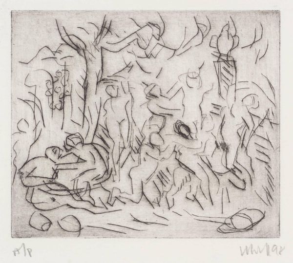 Curator: This etching is titled "The Triumph of Pan (2)" by Leon Kossoff, an artist born in London in 1926. Editor: It feels chaotic, doesn’t it? The lines are so dense, almost frantic, creating a sense of overwhelming energy. Curator: Kossoff often explored classical themes through a distinctly modern lens. "The Triumph of Pan," in particular, might be seen as a commentary on the complex relationship between human beings and nature, and our attempts to control it. Editor: The etching technique itself, with its network of lines, mirrors that struggle. The forms are barely contained within their outlines. It's as if the figures are dissolving back into the landscape. Curator: Indeed, perhaps Kossoff suggests that our triumphs are always fleeting, and that nature inevitably reclaims its space. Editor: A return to the wild, perhaps? A reminder that order is always on the verge of collapsing back into chaos. Curator: Precisely, the artist’s raw, expressive style perfectly encapsulates that tension. Editor: It certainly leaves you pondering the impermanence of things.
