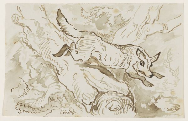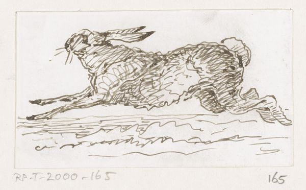This quick sketch, 'de Sprong', or 'the Jump', was made by Johannes Tavenraat in the 19th century, using pen and brown ink on paper. The choice of materials is notable. It's not a grand oil painting, but rather, an intimate drawing. The immediacy of the ink on paper captures a fleeting moment in nature. Tavenraat's skill is evident in the way he uses the pen to create texture and movement. You can see the hare's fur, the suggestion of a field, the distant figures of the horses and a cow. The drawing embodies a connection to the natural world, yet it is made with industrially produced materials. Ink and paper are not ‘natural’ materials, but rather commodified products of a modernising world. So, the drawing mediates between the experience of the Dutch landscape, and the everyday economics of its time. It invites us to consider the relationship between art, craft, and the industrial processes that shape our world.