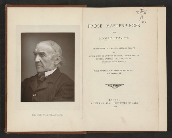 Editor: So, here we have an albumen print, a photograph titled "Portret van W.E. Gladstone," dating to before 1886, attributed to Elliott & Fry. It's mounted in a book. The print itself seems quite serious, formal, even a little severe. What historical narratives does this photograph evoke for you? Curator: Well, the photographic portrait became a powerful tool for constructing and disseminating images of power and influence in the 19th century. Gladstone was a towering figure in British politics, and a portrait like this serves a very specific purpose. Think about it: Who commissioned this image, and for what reason? Editor: That's a great point. Perhaps it was a way for Gladstone to project a certain image, a sense of authority and trustworthiness, given that photography was becoming more widespread and accessible? Curator: Precisely. And Elliott & Fry were a major studio, catering to the elite. Their portraits helped to shape public perception of Victorian society's key figures. This image isn't just about Gladstone as an individual; it's about the institutions and power structures he represented. Do you notice anything interesting about its presentation within this bound volume? Editor: Now that you mention it, it feels very deliberate, placing Gladstone amidst printed text, almost as if he's a character in a significant book of the era. The pairing emphasizes his legacy and influence. Curator: Yes, consider how such portrait albums circulated. These images became collectible objects, reinforcing social hierarchies. This format invites us to see Gladstone not only as a statesman, but as a figure enshrined in a particular historical narrative. Editor: I hadn't thought about it that way. Seeing the image as part of the broader social and political landscape really opens it up. Thanks for the perspective! Curator: Absolutely! It's crucial to remember that images don't exist in a vacuum; they’re always embedded within power dynamics and cultural narratives. Looking at this helps me contextualize how public perception gets influenced by this early form of media.