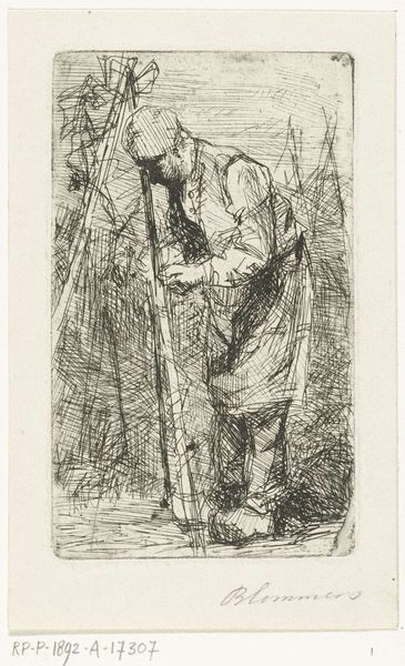 Editor: Here we have Anders Zorn’s “The Master-smith,” created in 1907. It’s a print, using etching and ink, and it presents a realistic portrayal of what seems to be a blacksmith at work. The crosshatching is very intense, creating strong contrasts. How do you interpret the composition of this piece? Curator: I am drawn to the rigorous structural integrity of the composition. Observe the dominance of the vertical and diagonal lines which gives the image a sense of stability and movement simultaneously. The lines of the subject’s clothing, along with the objects around him, create an almost architectural framework. Consider, for instance, how the light, captured by dense hatching, models the subject’s face, giving him both a physical presence and an emotive quality. Editor: Yes, the way the hatching models the form is fascinating! But why these harsh contrasts, these jagged lines? What purpose do they serve in the overall structure? Curator: Notice the contrast. Light versus shadow; detail against abstraction. These stark contrasts serve to emphasize not just the physical form but the implied energy of the blacksmith at work. The crosshatching creates the very texture of the subject’s world and calls to the industrial context that influences the forms themselves. Editor: So you see the texture and the contrast as ways of reinforcing the theme of labor, of industry itself being captured in these details? Curator: Precisely. Each stroke is not merely representational, but structural, contributing to the architecture of the image itself. By deconstructing the work into these essential elements—line, light, texture—we unlock a deeper appreciation of Zorn's meticulous orchestration. Editor: That’s given me a completely new way of seeing the piece! I hadn’t thought about the relationship between the technique and the subject matter so explicitly. Curator: It’s a conversation between the eye, the hand, and the conceptual framework. Reflect on this in relation to other works, and you’ll continue to see art through ever more discerning eyes.