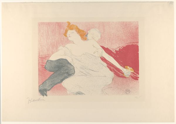 Curator: Lautrec always makes me feel something fierce. I mean, look at this lithograph, "Femme au plateau, Petit Déjeuner, Madame Baron et Mademoiselle Popo," dating back to 1896. Isn't there a loneliness radiating from the figure? A clown's outfit does not a joyful mood make. Editor: What strikes me first are the layers—the lithograph itself, the mixed media additions with watercolor and pastels. This layering process is so critical here. The way it captures both a flatness and a depth, almost a tactile experience in something essentially two-dimensional, emphasizes its fabricated essence, how far it deviates from portraying reality itself. Curator: Precisely! She's outside the spotlight. The figure looks both exhausted and wary. I mean, who knows what sort of evening she’s had, let alone the breakfast awaiting, but her glance speaks volumes. Almost a weary resignation, as if life itself is the stage and the costume's now smothering her. Editor: I'd like to address the very concept of artistic labor embedded in these techniques and choices. The printmaking—a multiplication, an industrialized form—intersects with the supposedly unique aura of "art," while his touches of color are almost as an after thought to it. It is almost the same alienation they each might be feeling toward labor of performing. Curator: Yes! This piece walks a fascinating tightrope. It lures you in with supposed glamour and then quietly unravels. The seemingly effortless line work of the lithograph combined with that rather brutally applied colour palette creates a tension – almost an existential tug-of-war. Editor: Absolutely, but this 'tension' also manifests from its role within commercial contexts. I believe it emphasizes not only an engagement in mass culture through print production but, more tellingly, with what that means to all of these figures at play in making art available or making their persona visible for consumption's sake, each layer speaking volumes to the business side. Curator: Beautifully said, that commercial reality—it echoes within that poignant gaze and speaks even beyond those printed lines, eh? Makes you question who exactly is the subject here? Or rather, *what* exactly. It certainly does resonate deeply. Editor: It's not about "is this a real person," it's more about unpacking how the means by which a depiction like this enters society. That interplay, the mechanical touching the artistic, has opened new pathways for inquiry. Thanks for opening this can, I feel as if that layer-on-layer idea can never just let anything sit.