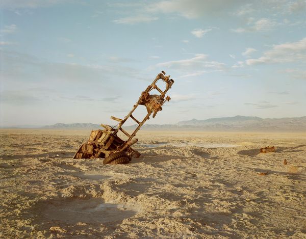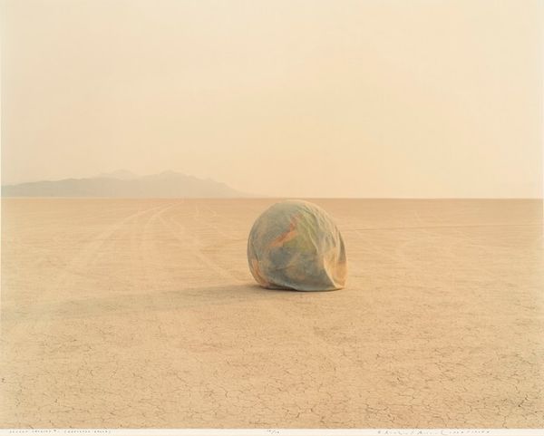 Curator: This photograph, potentially taken between 1987 and 1992, is titled "Bomb, Destroyed Vehicles, and Lone Rock, Bravo 20 Bombing Range, Nevada" by Richard Misrach. It is a C-print, a type of color photography. Editor: It feels strangely serene despite its subject matter. The warm, almost sepia tones and the vastness of the landscape create a sense of desolation, but also a kind of haunting beauty. The composition is quite striking, with the subtle horizon line dividing the frame. Curator: Precisely. The muted palette lends the scene a certain detachment, obscuring the violence implied by the title. The photograph possesses a structured visual paradox – a bleak landscape harboring both destruction and sublime aesthetics. Notice how Misrach uses color to aestheticize decay. Editor: I agree. Context is key here. The Bravo 20 Bombing Range was a site of military practice. Misrach's photographs of these landscapes serve as a stark reminder of human impact on the environment. They speak to a history of conflict and exploitation of natural resources. It reflects on the political nature of landscape photography, don't you think? Curator: Yes, Misrach consciously employs compositional strategies that subtly undermine traditional landscape photography. Note the flat horizon and minimal depth of field; this visually flattens the pictorial space. The inclusion of the rusted vehicle remains challenges our notion of pictorial space. We are not supposed to find them beautiful, but we do. It almost verges on pop-art with the repetitive elements and commentary on capitalist detritus. Editor: It definitely pushes the boundaries of what constitutes a landscape photograph. There’s an element of institutional critique too, in showcasing the results of governmental or military action within this space. It acts as a counter-narrative. Curator: Indeed. And by using the conventions of landscape photography, Misrach creates a critical commentary, transforming this zone of military operations into a space of profound, albeit unsettling, beauty. The C-print medium, normally used for consumer-level snapshots, gains new layers of significance. Editor: Considering Misrach’s earlier series on the desert, one can consider the recurring visual vocabulary within his diverse collection and how he sought to subvert romantic conceptions of the frontier and wilderness that were popular at the time. It asks who the land belongs to. Curator: Looking closely allows one to decipher formal and political aspects, showing how such seemingly opposing principles can converge. Editor: And how a single image can carry layers of social, political, and art-historical resonance, and can remind us about land use and militarism in America.