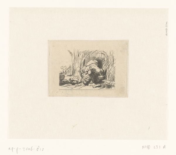 Louise Danse created this print titled 'Breiende vrouw aan het raam'—or 'Knitting woman at the window'—using etching in 1888. Danse lived in a historical moment where gender roles were clearly defined, with domestic activities like knitting often relegated to women. In this image, the woman is seen from behind, engaged in the act of knitting, her gaze directed towards the outside through a window filled with light and plant life. It seems to capture a quiet, contemplative moment. The composition is interesting; the interior space is intimate, with the woman positioned within a domestic scene. Danse seems to offer an alternative to traditional representations of women, by focusing on the quiet dignity of domestic life. The act of knitting becomes a space for reflection. The artwork gently invites us to consider the value and complexity of women’s experiences within the domestic sphere.