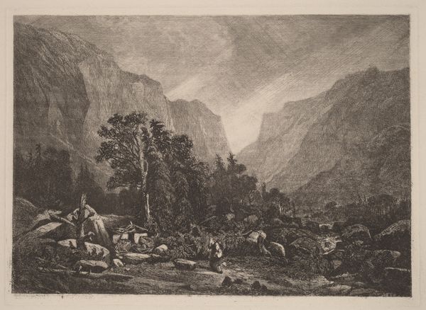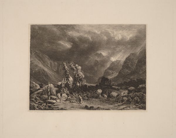 Curator: Here we have "Mountain Storm," an etching by Alexandre Calame, created in 1840. Editor: It hits you right in the gut, doesn’t it? All swirling, roiling, almost oppressive sky, then these little tenacious trees clinging to what I assume is supposed to be solid earth...makes you think about persistence in the face of overwhelming forces, right? Curator: Absolutely, and that emotional charge is heightened, I believe, by the etching process itself. The lines are meticulously placed, a result of labor intensive work to create a single print, yet the image portrays nature as a place of constant flux and almost violent drama. How are we meant to consume and think about the production? Editor: Interesting. You know, I didn’t even register that—production as almost at odds with the image! But yeah, it makes you consider the hours, maybe days, Calame dedicated to capturing this one ephemeral moment. What’s fascinating is how it seems to speak directly to that Romantic ideal, the sublime, while at the same time really grounding you in material reality of labor and process, which seems antithetical. Curator: Exactly! The etching process itself becomes part of the story, almost like labor mediating nature or the artists emotional experience of it! These kinds of images become very popular—distributed images that offer what, an idealized form of encounter? Editor: A packaged experience! And the size too; you imagine it almost being distributed and passed around! And something about the tonal range, from nearly white sky to deepest blacks in the foreground, heightens the feeling...it's not just about depicting a storm; it's about *feeling* it. Curator: True, but is that individual "feeling" manufactured in relation to a distributed art object? Its commodity status part of the storm-viewing equation? Editor: Right! Okay, now that *is* an intriguing layer to unpack in this print. So, you know, in a weird way it humanizes the sheer overpowering scale of everything that it represents...sort of makes the monstrous manageable by bringing it to your own drawing room. Curator: That is beautifully put. A powerful distillation of Romanticism in material form!