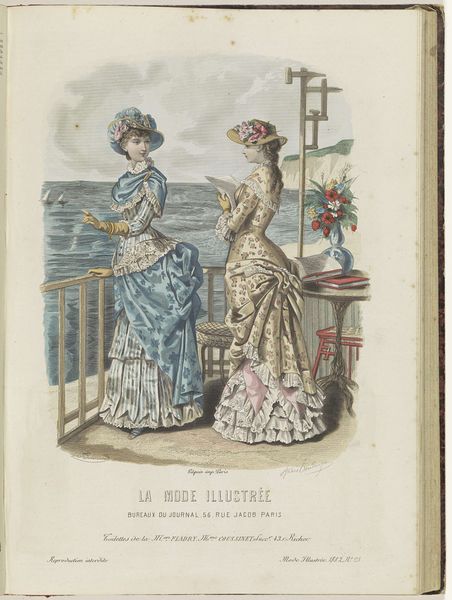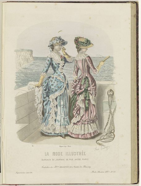 This fashion plate is from La Mode Illustrée, a French journal published in 1882 by Firmin-Didot & Cie. It offers insight into the visual codes of late 19th-century bourgeois femininity. Here, the seaside provides a backdrop for displaying elaborate dresses. Note how the visual emphasis is on ornamentation rather than the female form itself. Such images reflected and reinforced a strict social hierarchy, where visual appearance signaled one’s class and status. The journal itself played a role in shaping these norms. It dictated the latest styles but also perpetuated a conservative image of women's roles. To understand this image fully, we might research the fashion industry of the time, or delve into the history of French publishing and its influence on social mores. In doing so, we recognize that art, even in commercial form, is a product of specific social and institutional forces.