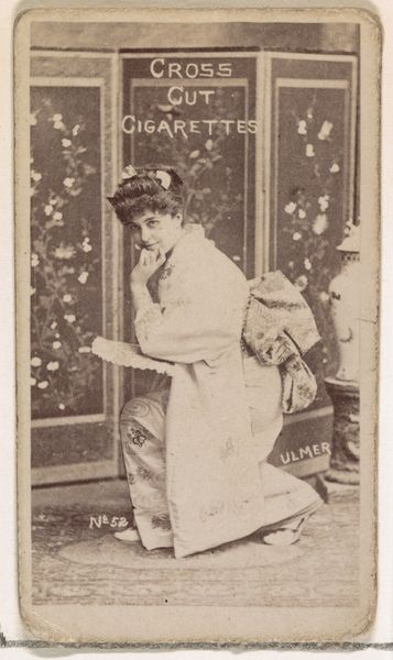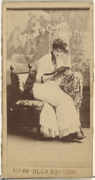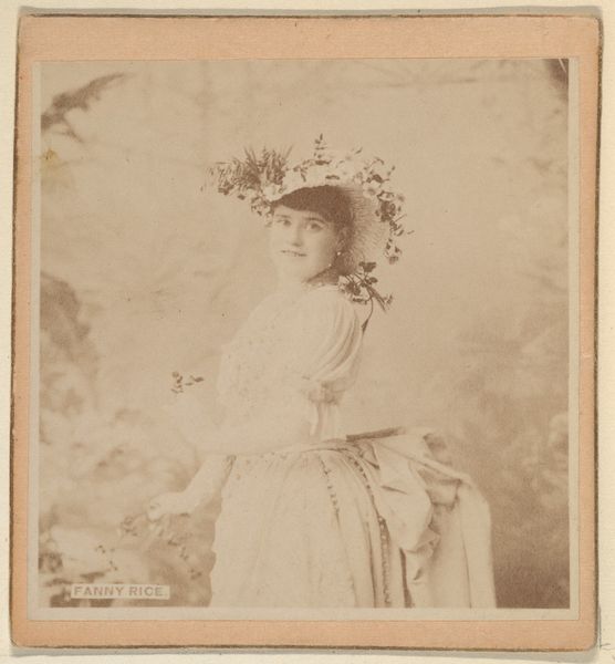 Curator: What strikes me immediately is how… sepia-toned dreams smell. All at once antique, theatrical, a little sad. She's almost swimming in that dress, don't you think? Editor: Indeed. What we're observing is a photographic print from Goodwin & Company, dating from about 1886 to 1890. It's titled "Annie Robe, from the Actors and Actresses series (N171) for Gypsy Queen Cigarettes." This piece sits within a larger cultural phenomenon – the rise of celebrity endorsements, and tobacco companies exploiting the popularity of stage actresses to market their product. Curator: Celebrity…cigarettes. That explains the knowing, slightly world-weary look. Editor: Absolutely. Consider the construction of femininity at the time, how stage actresses often defied rigid Victorian norms, and how the simple act of smoking was becoming coded as both rebellious and fashionable for women. The light pencil work is such that the portrait is like a soft and romantic veil, but she sells poison, and, likely, sold her image to male audiences. It becomes a powerful tension. Curator: It's…complicated. Almost like they're using her beauty to cover something more complex. A little unfair if you ask me! Like a performance *of* femininity as much as a representation *of* it. It seems like she isn't completely in control. It feels off, somehow. Editor: It’s a product of its time, but that doesn’t negate the discomfort that viewing it may still provoke today. And such historical context makes us understand some nuances in the work. It isn't simply a pretty picture; it is a commentary of many levels when we dissect who had the real power here. Curator: You're right. It's more layered than my initial sepia dream. It shows you should dig into those 'off' feelings, and not settle with just initial aesthetic observations. Editor: Yes! It goes to show how vital a broader awareness of gender, class, and consumption patterns can shape our engagement with these objects. Art always exists within historical currents. Curator: Absolutely! Well, after all this deep dive into intersectionality and art, I might have to go out there and light a… Nevermind. Just kidding! Thanks for the chat, truly insightful!