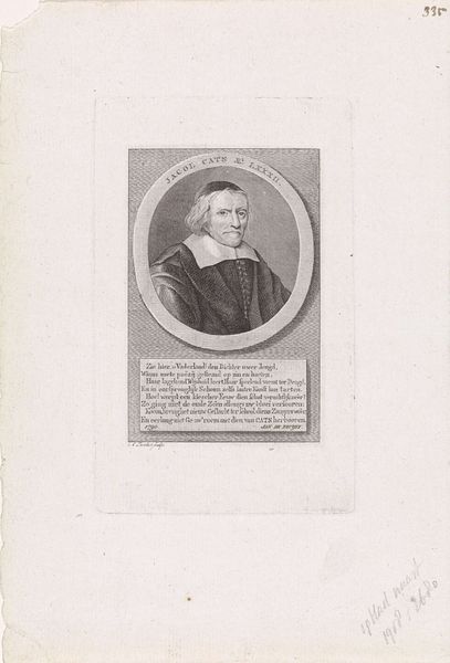 This engraving of Jacob Cats by Edouard Taurel captures the essence of the sitter through a careful selection of symbols. His attire, particularly the dark robe and white collar, marks him as a figure of learning and authority, a visual cue deeply rooted in the traditions of the Dutch Golden Age. The presence of a coat of arms subtly speaks to familial legacy, power, and heritage. This motif echoes across time, reminiscent of ancient Roman family crests, each a marker of lineage and stories passed through generations. The oval frame is not a mere design choice but a recurring symbol, a variation on the mandorla, that appears in sacred art across cultures and throughout history. Encapsulating Cats, it bestows a sense of timeless importance, subtly inviting viewers to consider the weight of his contributions. We are engaged in a dialogue that transcends mere observation, stirring a deep, subconscious recognition of inherited symbols and their continued influence.