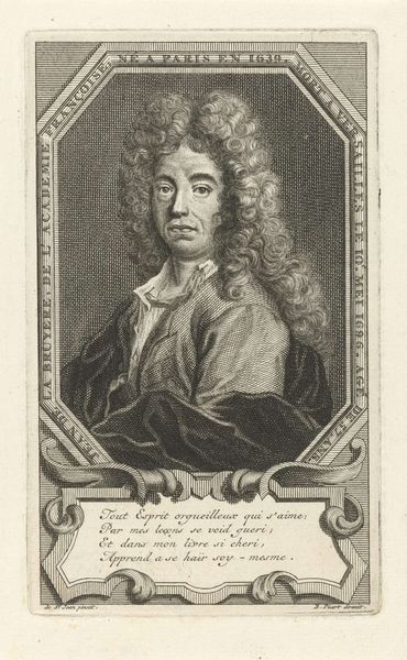 Curator: This engraving presents Evelyn Pierpoint, Duke of Kingston. The work, done by Jan Faber the Younger, captures its subject with detailed precision. Editor: The immediate feeling is one of calculated display – a performance of power, really. Curator: Indeed. The symbols are rife. The wig, the starburst emblem, even the posture, all speak to a carefully constructed identity. How does that resonate today, do you think? Editor: It brings to mind contemporary discussions around performativity and gender. The Duke is embodying a role, negotiating visibility and status. Curator: The context certainly shifts when we consider these images through the lens of power and its historical representation. Editor: Absolutely. It makes you consider how symbols can reinforce and also challenge social norms. A lasting imprint of a bygone era. Curator: It’s a powerful reminder of the many ways we use imagery to communicate.