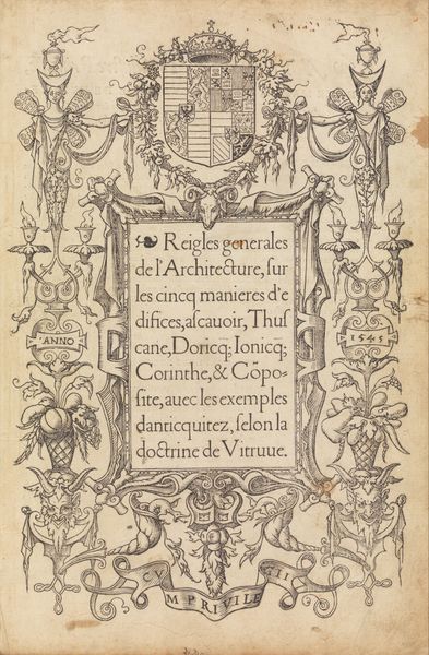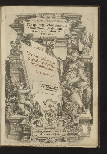 This is the title page from an album, likely created in the late 16th century. The anonymous artist has employed engraving to construct a visually dense and architecturally themed composition. The structure features two sculpted figures or "terms" supporting an elaborate arch. The arch frames a heraldic shield surrounded by garlands and cherubic figures. The texture, achieved through fine, deliberate lines, creates depth and volume. The formal structure of the page—the symmetrical arrangement of figures, the arch, and the shield—reflects an interest in order and proportion, values central to the architectural treatise it introduces. Yet, within this symmetry, there’s a destabilization of fixed meanings. The monstrous male figures and elegant female figures contrast the heraldic symbolism and playful cherubs. This tension suggests the complex interplay between classical ideals, heraldic tradition, and the emerging aesthetics which were hallmarks of the period. The engraving challenges us to reconsider how form can both uphold and question established values.