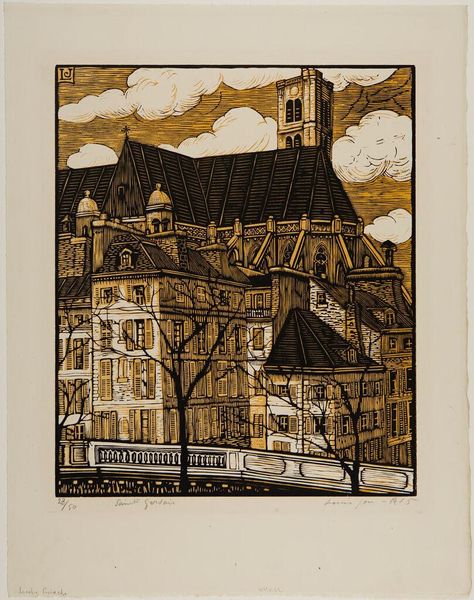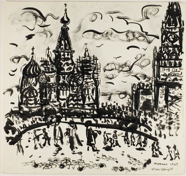 Curator: Welcome. We are looking at Ivan Albright’s “Moscow,” created in 1967 using acrylic paint. Editor: Thank you. It's quite striking how he uses mostly reds, pinks, blues, and blacks to depict this city scene. It feels very expressive, almost turbulent. What do you see when you look at this piece? Curator: First, note the interplay between the flat planes of color and the attempt at perspectival depth. The buildings, while rendered in bold strokes, lack consistent perspective. The sky mirrors the ground—an inversion perhaps hinting at semiotic anxieties around representation itself. Editor: I see what you mean. The use of color definitely dictates the perspective. There is a slight flatness because of it, right? Curator: Precisely. It is as if Albright prioritizes color and texture, emphasizing the medium over strict representational accuracy. Observe how he juxtaposes patches of intense reds with pale pinks and sharp blacks, building the city with blocks of emotive color rather than lines of definition. It challenges traditional cityscapes through expressive brushwork, would you agree? Editor: I do. And is he purposely distorting the architectural forms for a heightened sense of emotion? Curator: Quite possibly. Think about what architectural semiotics communicate. Solid buildings traditionally suggest permanence and power, but here, that’s undercut by fluid color and shape. This piece presents us with the *idea* of Moscow, constructed not from concrete, but color, texture and brushstrokes. A powerful statement about the act of seeing, wouldn't you say? Editor: That's a really interesting way to consider it. Now I see so much more depth beyond just the image of the cityscape. Curator: Exactly. Formal analysis helps us decode beyond the surface, it reveals the very structures that carry meaning.