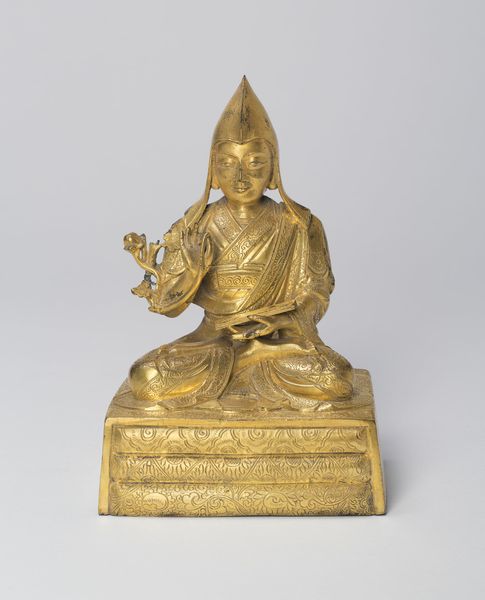 Curator: This bronze sculpture, dating to the 18th or 19th century, is entitled "Enlightened Protector Mahakala with Six Arms." It's currently housed at the Art Institute of Chicago. Editor: It immediately strikes me as a fearsome figure. The pose, the six arms brandishing symbolic objects, the rather menacing expression…there's a palpable sense of power, both protective and destructive. Curator: Precisely. Consider the careful rendering of form. Note the balanced asymmetry, how the artist uses line and mass to convey movement and stability simultaneously. Observe also the subtle gradations in the bronze itself, creating texture that amplifies depth. Editor: Thinking about power, it makes me wonder, who did this protector serve, and against what dangers? Looking at the specific era—the 18th or 19th century—that points to a period of significant social and political upheaval across Asia, potentially reflecting heightened anxieties around security and cultural preservation. Who might have commissioned such a piece and what role did it serve in that context? Curator: Certainly, the social and political environment is a consideration. But first, let's dwell on its form: its symmetrical posture against its detailed adornment provides a rich dynamic between its surface and core elements. Do you notice the flames emanating from the top of his head, providing contrast against his corpulent form? Editor: Those flames are arresting! Perhaps symbolizing a fiery energy that consumes ignorance and protects the enlightened. However, even in that seemingly individual and religious practice of pursuing enlightenment, it has historical relevance. Mahakala's imagery is undeniably potent, but whose voices are amplified by using symbols of protection to silence marginalized or competing narratives? Curator: Your interpretation of power and narrative certainly opens a further conversation. Returning to the bronze itself: observe its method of facture as its golden hue interacts with reflected light, highlighting the subtle intricacies of each accessory on each of its six arms! Editor: And therein lies its appeal: a complex dialogue between artistic mastery and complex issues surrounding protection, identity, and perhaps even control. It challenges us to reflect critically. Curator: Agreed. It is indeed a fine intersection between artistic value and cultural context.