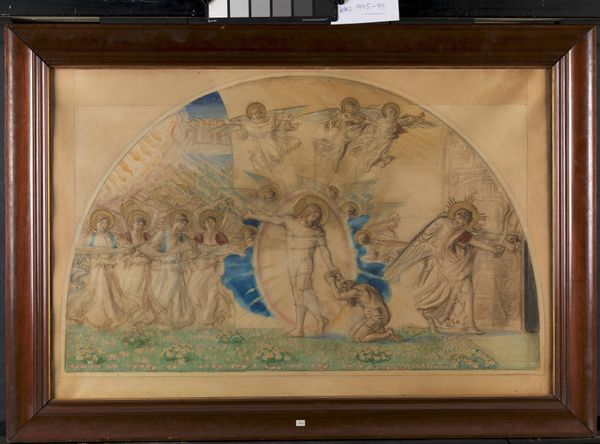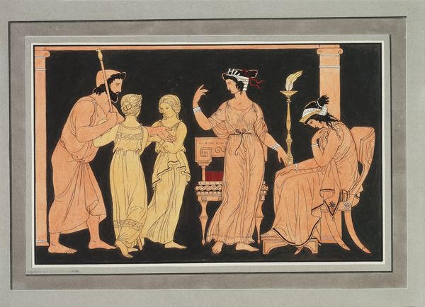 Editor: This watercolor piece is titled "A Sketch for a Fresco" by Károly Lotz. It depicts figures around a fountain, and it looks like the Renaissance style, even if the date is missing. I'm immediately drawn to the people collecting the water. What do you see in this piece that helps contextualize it? Curator: I see a powerful illustration of access and privilege, literally visualized around this source of life – water. Who gets to drink, and from what vessel? Notice the man in red, his garments suggesting status, drawing water with ease, while the women, one burdened by a vessel, seem to share a common experience of servitude or perhaps a lower social stratum. Editor: So, the simple act of collecting water becomes a statement? Curator: Precisely. Art often serves as a mirror, reflecting societal hierarchies. Who is allowed to partake freely, and who must struggle? How might the location of this fresco impact its meaning? Editor: You mean, like, if it were in a wealthy household versus a public space? Curator: Exactly! A private setting could signal the owner’s dominance and status, reinforcing existing power structures. Public space could have been different. What might it mean to offer clean water as an equal source? Also, note the narrative tradition and historical painting in it: perhaps some figures could represent the local rulers or patrons. This also adds a complex context layer of hierarchy. Editor: I never would have considered all of that just from looking at the figures around a fountain! Thank you for showing that to me! Curator: The joy is mine! I find that thinking about social power structures brings life to paintings. Looking closely reveals so much.